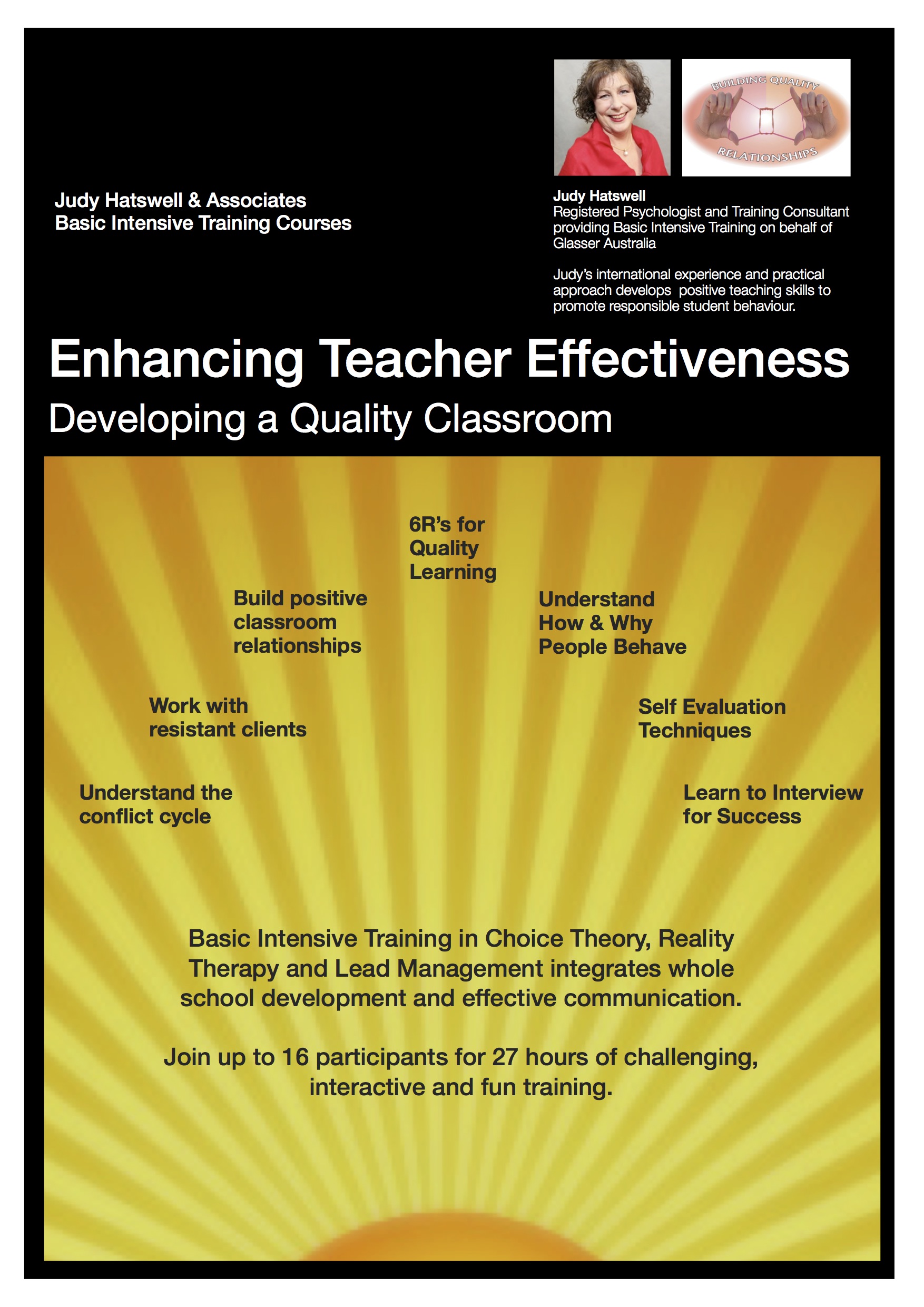 Judy is recognised Australia wide for her outstanding knowledge in the area of student welfare, behaviour management and whole school approaches enabling students to be responsible for their behaviour. Her workshops focus on teachers learning practical skills for implementation in the classroom. Judy has been teaching Choice Theory/Reality Therapy courses for schools since 1980. She has assisted schools to implement Glasser's strategies as an approach for Whole School Programs, classroom implementation and highly successful techniques for working with individual students.